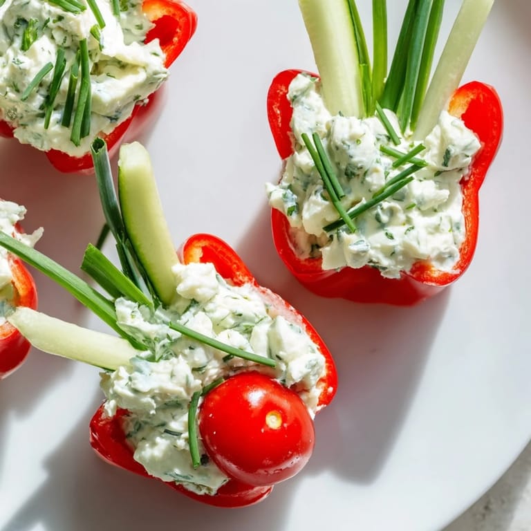 Anheften Bunte und frische Frühlingsvorspeise mit knackigem Gemüse, das wie essbare Tulpenblüten arrangiert ist und mit cremigem Kräuterfrischkäse gefüllt wird. Perfekt für festliche Zusammenkünfte oder leichte Vorspeisen.