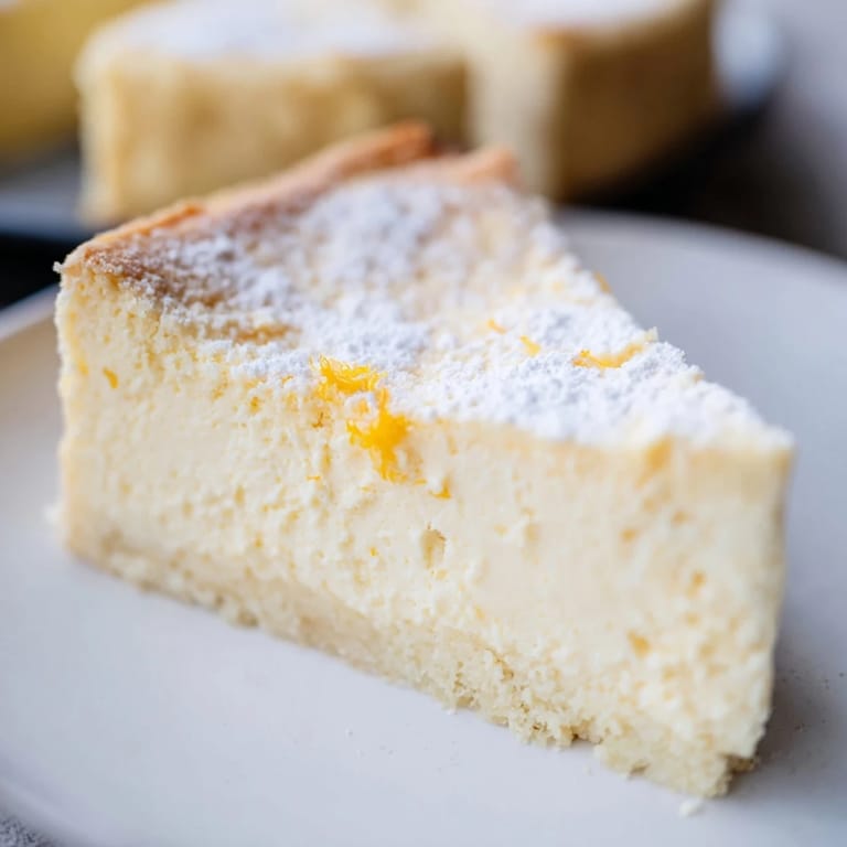 Anheften Ein leichter, cremiger Käsekuchen mit einem zarten, buttrigen Boden und einem dezenten Hauch von Zitrus, dieses klassische deutsche Dessert ist perfekt für jeden Anlass.