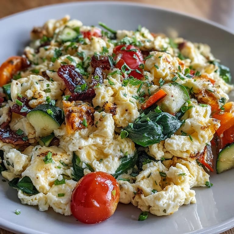 Anheften My neighbor stopped by one Tuesday morning with a basket of tomatoes from her garden, and I suddenly had that familiar panic of what to do with them before they softened. I grabbed some eggs from the fridge, chopped whatever vegetables were lingering in the crisper drawer, and threw together what became my go-to breakfast when I want something that feels both simple and a little special. Twenty minutes later, we were sitting on her porch eating fluffy scrambled eggs dotted with bright red tomato bits, and she asked for the recipe before finishing her plate.