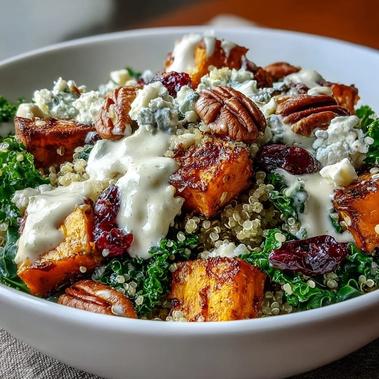 - Divide warm quinoa among 4 bowls, layer massaged kale on top, scatter roasted sweet potatoes, pecans, cranberries, and crumbled blue cheese across each bowl, then drizzle generously with lemon tahini dressing. The warmth of the potatoes and quinoa will slightly soften the cheese and allow flavors to meld.