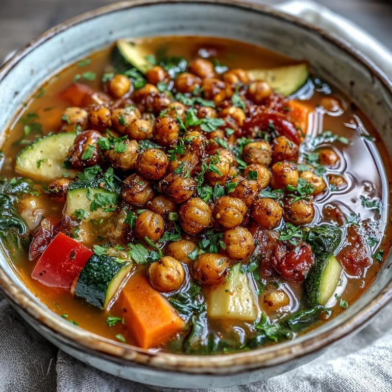 Anheften Als ich vor ein paar Jahren beschloss, mehr pflanzliche Gerichte zu kochen, stolperte ich über dieses Rezept für Gewürzte Kichererbsen-Gemüsesuppe. An einem regnerischen Herbstnachmittag duftete meine kleine Küche bald nach diesen wunderbaren östlichen Gewürzen, während die Kichererbsen im Ofen rösteten. Der Kontrast zwischen den knusprigen Kichererbsen und der samtigen Suppe war eine Offenbarung – als hätte ich ein kulinarisches Geheimnis entdeckt, das ich schon immer kennen sollte.