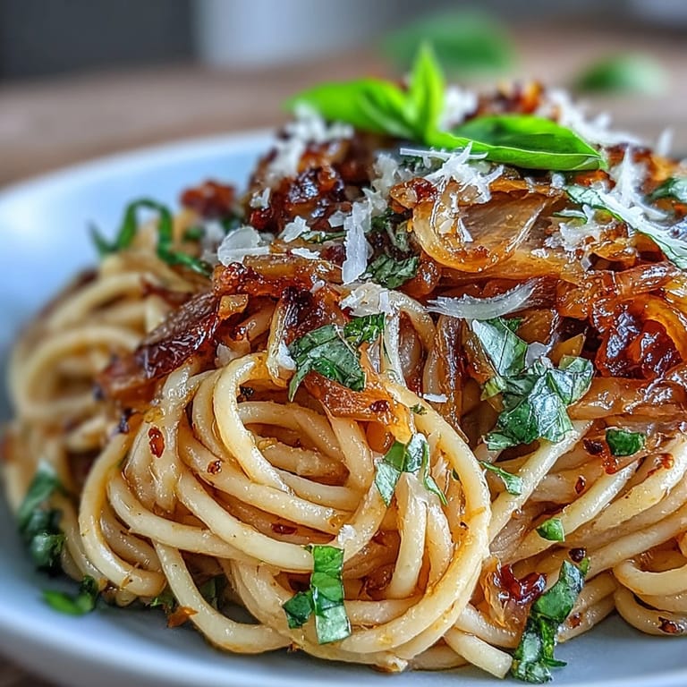 Anheften Last Tuesday, I stood in my kitchen watching onions turn from pale strips into glossy amber ribbons, and suddenly my whole apartment smelled like caramel and possibility. That's when I knew I'd stumbled onto something special with this pasta. The trick isn't fancy or complicated—it's just patience and the magic that happens when you let onions do their slow, quiet work on the stovetop. Add a homemade chili oil with its own fragrant warmth, and you've got something that tastes like you spent hours cooking when really, you just spent them mostly waiting. This dish proved to me that the best meals don't need to be complicated, just intentional.