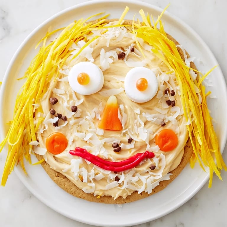 Anheften Ein verspieltes und festliches Süßigkeiten-Tablett, das wie ein fröhlicher Vogelscheuche aussieht – perfekt für Herbsttreffen, Halloween-Partys oder als spaßiges essbares Zentrum.