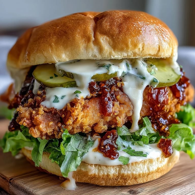 Dieses köstliche Sandwich kombiniert ultra-knuspriges, scharf frittiertes Hühnchen mit einer samtigen hausgemachten Sauce auf einem butterigen Brioche-Brötchen. Die Marinade aus Buttermilch und Gewürzen sorgt für Zartheit, während die Panade aus Mehl und Maisstärke den perfekten Crunch liefert. Die cremige Sauce aus Mayonnaise, Saurer Sahne und scharfen Elementen balanciert die Hitze ideal. In nur 95 Minuten fertig, perfekt für Familien oder Gäste.