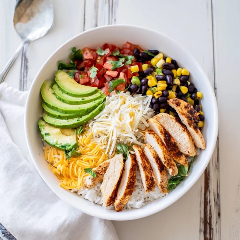 Manchmal tausche ich den weißen Reis gegen Vollkornreis oder Quinoa aus, das macht die Bowl noch sättigender und nussiger. An besonders hungrigen Tagen füge ich gewürfelte Jalapeños oder scharfe Sauce hinzu, für noch mehr Kick. Wenn ich es cremiger mag, rühre ich einen Löffel Sauerrahm oder griechischen Joghurt unter die Salsa. Für eine vegane Version ersetze ich das Hähnchen durch gewürzte Kichererbsen oder Tofu, und lasse den Käse einfach weg. Die Bowl ist so flexibel, dass sie sich jeder Laune und jedem Kühlschrankinhalt anpasst.