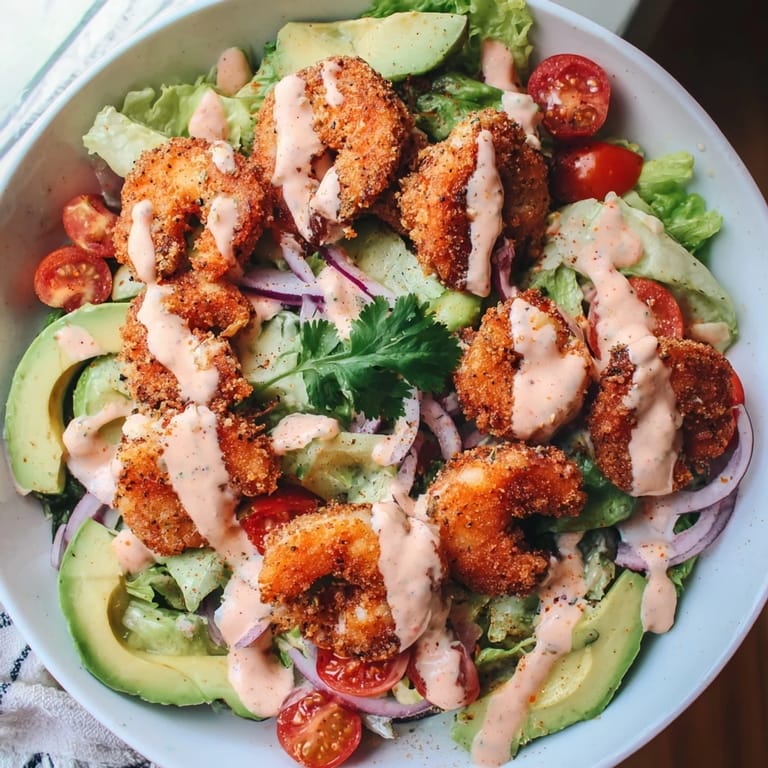 Anheften Eines Abends, als ich in einer kleinen Küche in Miami stand, bemerkte ich, wie meine Großmutter eine Schüssel mit knusprigen Garnelen in leuchtend grüne Blätter legte und dann ein zartes Rosa-Orange-Dressing darüber träufelte. Sie sagte einfach: Das ist keine klassische Mahlzeit, sondern ein Moment. Seitdem habe ich diesen Salat tausendmal gemacht, und jedes Mal fühle ich mich in diese Küche zurückversetzt, in der die Hitze und das Crunch-Crunch der Panko-Panade so lebendig waren wie die Musik, die durch die offenen Fenster kam. Es ist das Einfache, das Köstliche macht.