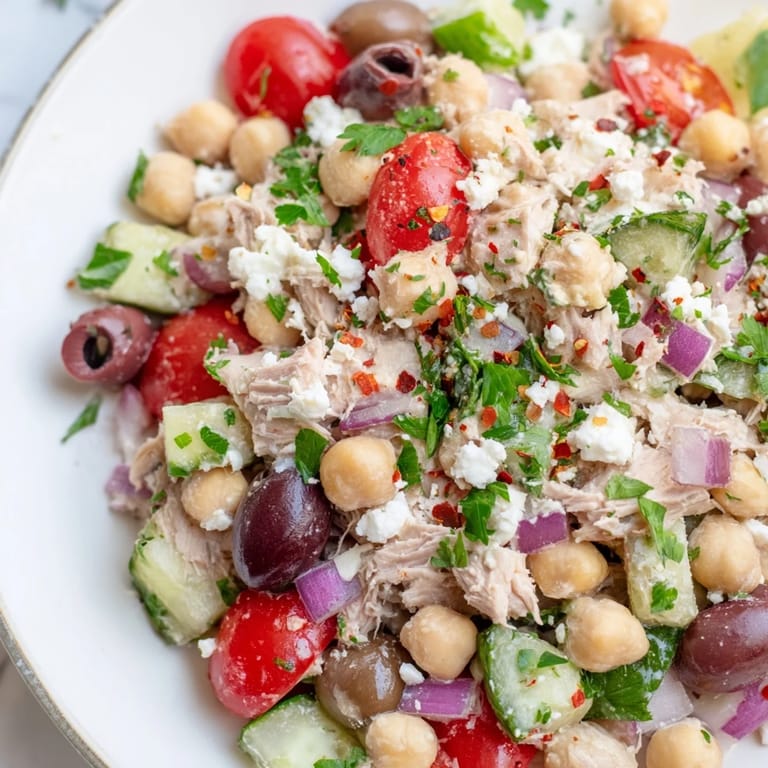 Anheften Ich habe diesen Salat an einem heißen Nachmittag entdeckt, als ich aus meinem Kühlschrank nur Thunfischkonserven, Kichererbsen und ein paar Gemüsereste fand. Statt zu bestellen, schnippelte ich schnell alles zusammen und war überrascht, wie sättigend und lecker das Ergebnis war. Seitdem ist das meine geheime Waffe für stressige Wochentage geworden – schnell, nahrhaft und so befriedigend, dass ich nicht einmal einen Nachtisch vermisse.