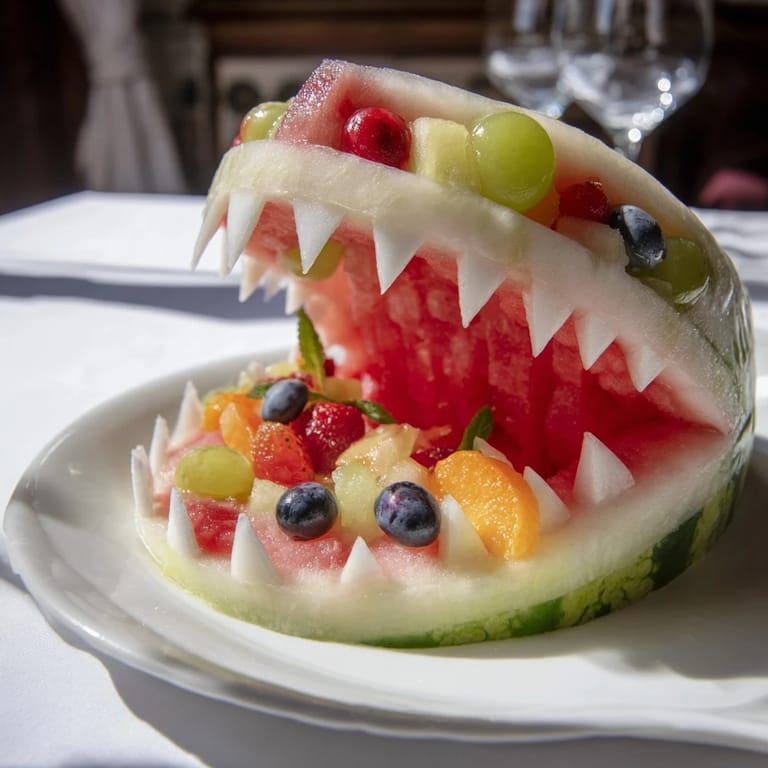 Anheften Ein verspieltes und erfrischendes Sommerobstplatten-Rezept mit einem ausgehöhlten Wassermelonen-Hai, gefüllt mit saftigen Früchten, perfekt für Partys und kinderfreundliche Treffen.